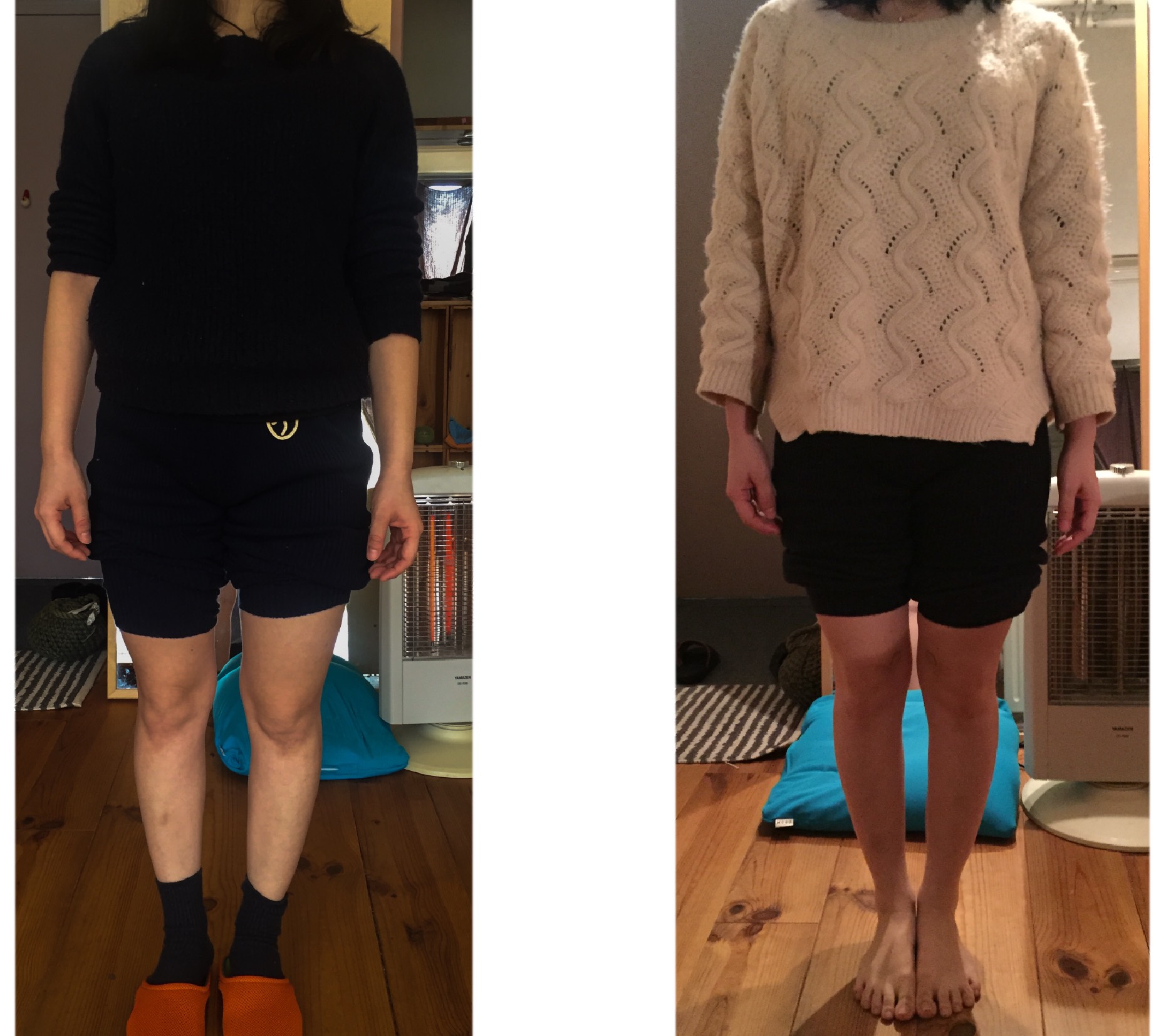 右の足首をみると内側のくるぶしが内側に倒れこんでいるのがわかります。